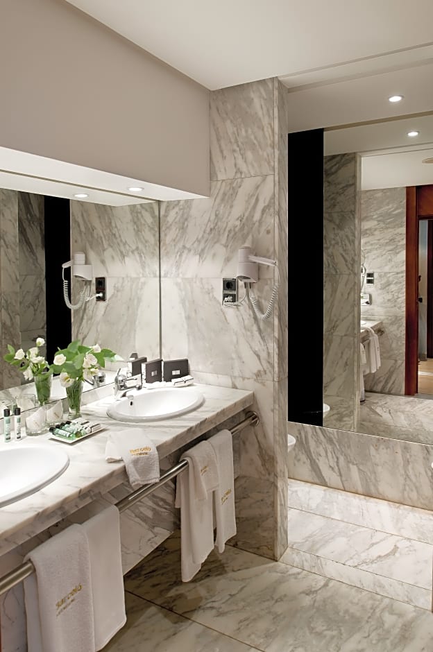 These rooms measuring 40 sqm are spacious and offer wonderful natural light and modern- elegant decor. King size bed (2x2m) or two double beds, laminate flooring and large windows offering views of the Guadalquivir river- the hotel gardens or Alamillo Park (depending on their orientation). These rooms offer a large range of services, amenities and equipment mini-bar, flat-screen satellite TV, a lap-top fit safe a pillow menu, Nespresso Coffee Machine and a private bathroom with a bath, hairdryer and magnifying mirror. Iron and ironing board (free of charge).